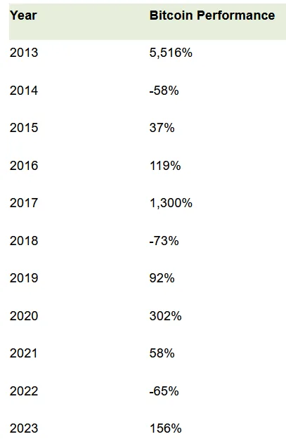 Yllä Bitcoin tuottohistoriaa. Vuotuisella tasolla erittäin suuria tuottoja. Muutama huono vuosi on joukossa. (Lähde: Bitcoinmagazine).