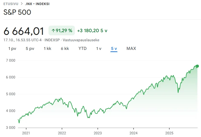 Vasemmalla viiden vuoden arvon kehitys S&P500 indeksille. Oikealla viiden vuoden arvon kehitys Bitcoinille. Visuaalisesti jotain samaa on havaittavissa käyrien muodoilla. (Lähde: Google Finance).