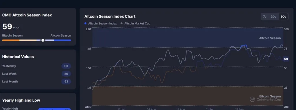 Yllä tilanne 7.10.2025. Lähde: Coinmarket Cap, Altcoin Season Index.