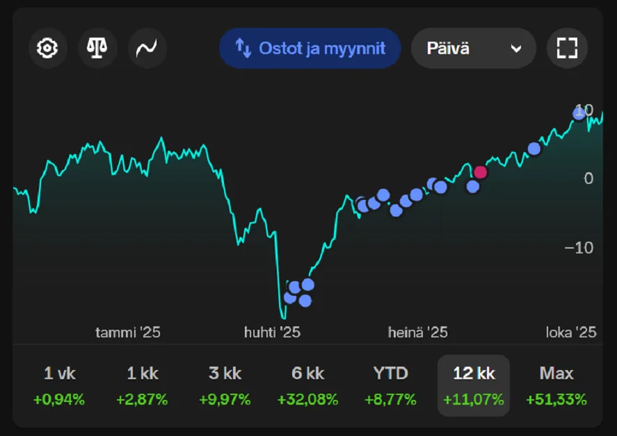 SP500 on nyt korkeammalla kuin koskaan. Kun se tulee alas – ja se tulee – moni säikähtää. Mutta viisas sijoittaja tietää, että jokainen romahdus on vain uusi ostopaikka, uusi kierros pitkässä pelissä. Tärkeintä ei ole arvaaminen, vaan se että pysyt mukana, kun pöly laskeutuu. Ja jos hermot eivät kestä, korkorahasto tarjoaa pehmeämmän laskun. Sijoittaminen ei ole sprinttiä, vaan maraton, ja juuri nyt olemme mäen päällä, missä maisemat ovat parhaat mutta happi vähissä.