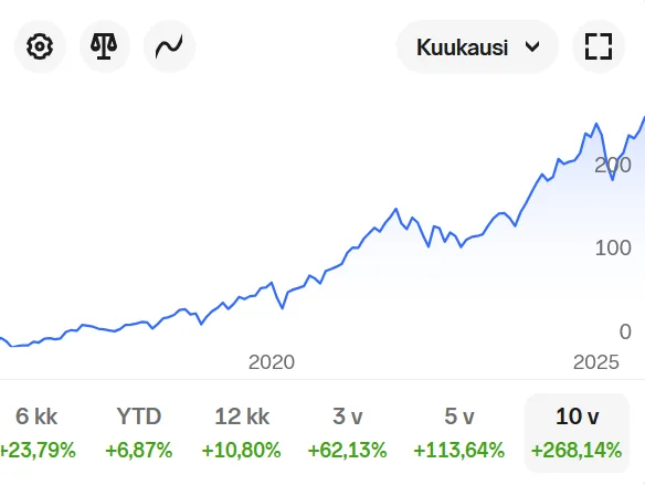 Yllä Nordnet Suomi Indeksi tuottohistoria kymmenen vuoden ajalta. Tuona aikana tuotto on ollut keskimäärin 16,7% vuodessa, mikä on aika huikea kun keskimääräinen sijoittajan vuosituotto-odotus voi olla jotain 8%.Lähde: Nordnet.2.11.2025.
