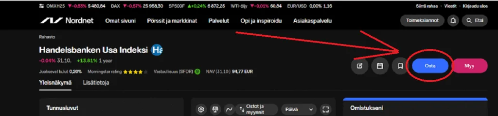 Vaihe 3: tee ensimmäinen osto (esimerkissä on Handelsbanken USA Indeksi, mutta vaihda sen sijaan Nordnet Suomi Indeksi jotta voit ostaa tämän artikkelin rahastoa).