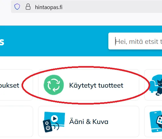 Palvelusta löytyy myös käytettyjä tuotteita. Tuolla näkyy olevan kaikenlaista, pleikkaripelejä, drooneja, kameroita. Hintaopas mainostaa että käytetyillä tuotteilla on palautusoikeus, ja niistä saa usein tuotetakuun. Alla kuvassa näkyy “Käytetyt tuotteet” napin sijainti:
