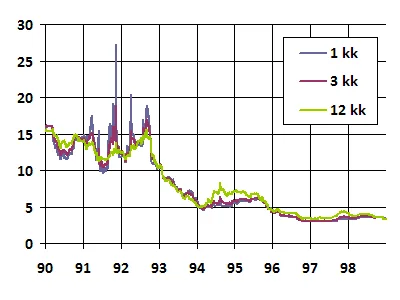 Helibor korko nakutteli vuodesta 90 vuoteen 93 aika lailla 12,5% tasolla. Tämän jälkeen tiputtiin 5% tasolle vuonna 1994, ja siitä nelosen tuntumaan Helibor koron loppuun asti vuoteen 1998.