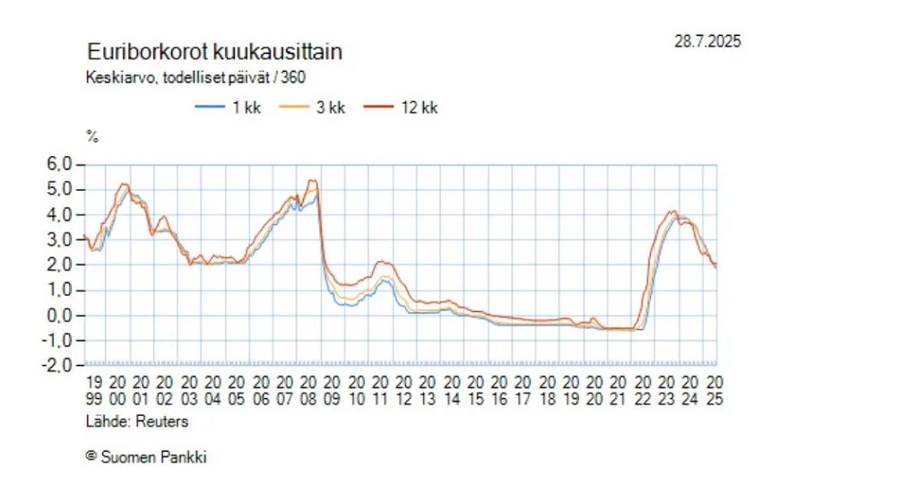 Suomi siirtyi Euribor korkoon 1999. Alla kuvaaja Euribor korosta vuodesta 1999 vuoteen 2025. (Lähde: Suomen pankki).