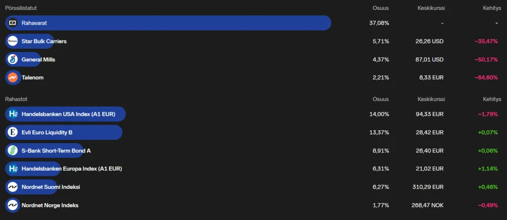Alla näkyy omistukseni ENNEN korkorahastojen lisäystä, koska kaupankäynnissä kestää aikaa. Jokatapauksessa, S pankin lyhyt korko A:n osuus ja Evli likvidi B:n osuus tulevat kasvamaan n. 5% tästä, ja käteisvara lyhentymään n. 10%.