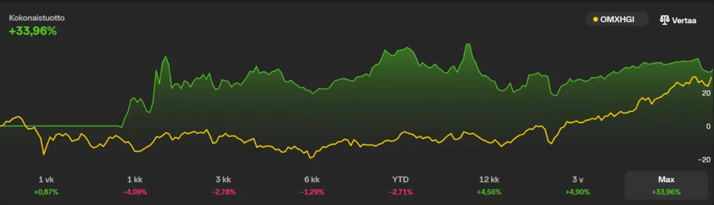 Yllä Nordnet salkun tuotto %. 2022 – 3.4.2026.